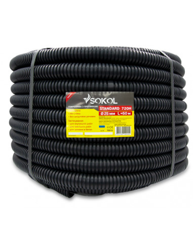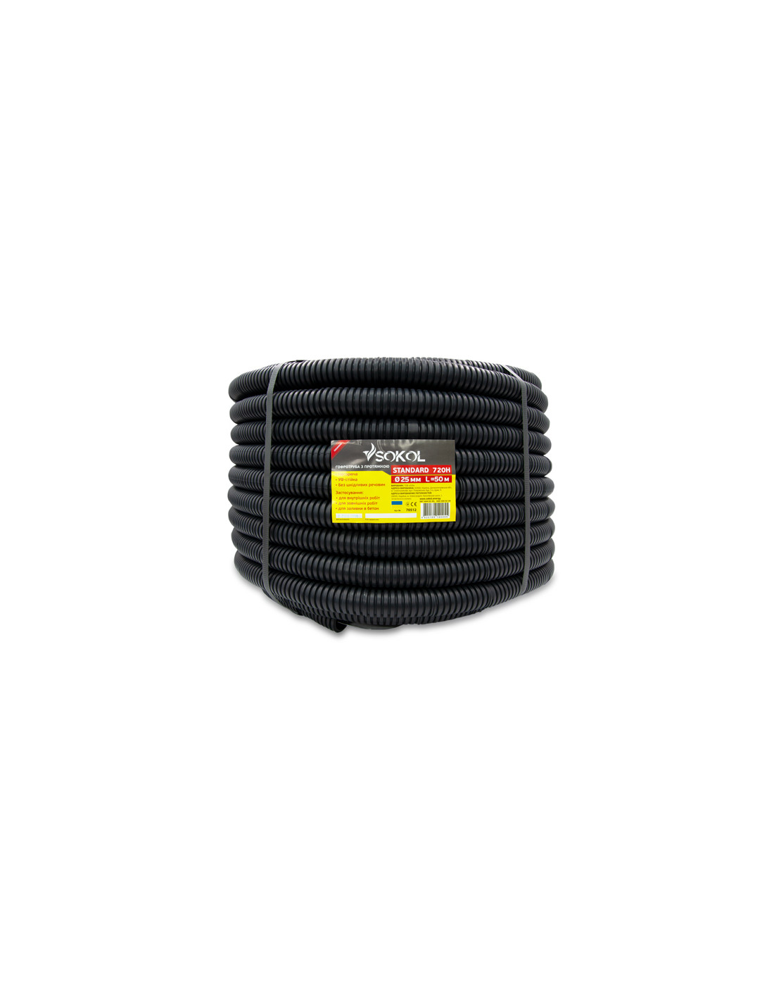 Гофрированная ПВХ труба Sokol Standard d25 представляет собой пластиковые трубчатые каналы для установки в них электрических кабелей, для защиты от пыли, влаги